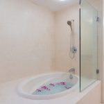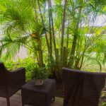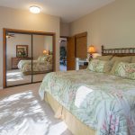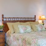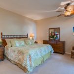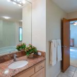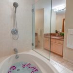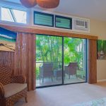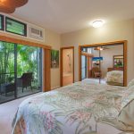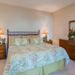 The master bedroom retreat features a king-size bed and a cozy private lanai. Relaxing in this quiet and comfortable space will have you set for another day of Maui adventures. The attached remodeled master bathroom boasts twin vanities with granite countertops, a shower, and a large soaking tub, perfect for unwinding.
